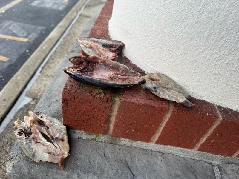 went out to eat at a buffet and right outside the entrance, all the pillars out front had fish parts around them.